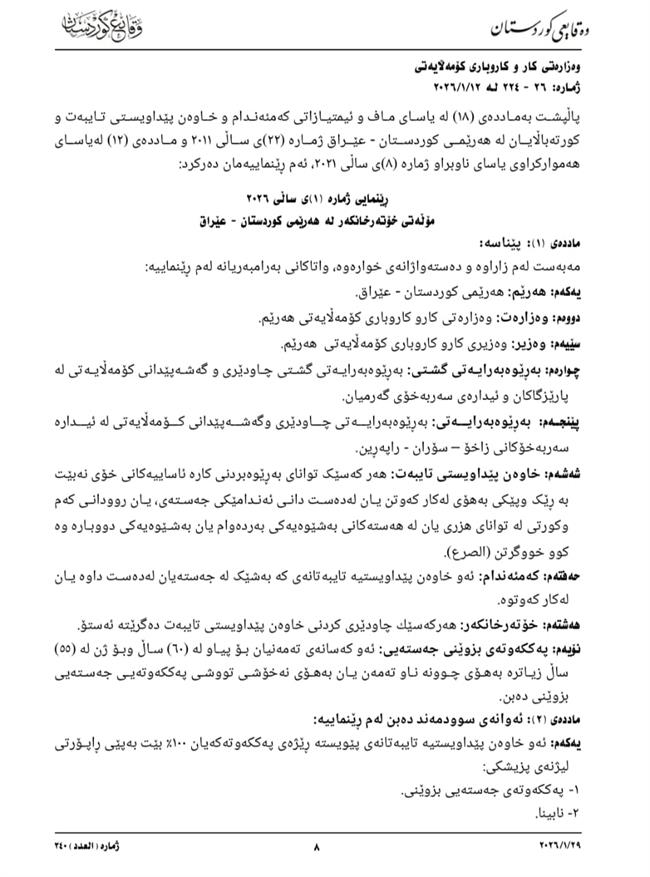🔵وەزارەتی کارو کاروباری کۆمەڵایەتی بە ڕێنمایی ژمارە 1ـی ساڵی 2026، ڕێنمایی پێدانی مۆڵەتی بەخێوکاری هەموارکردەوە تیایدا گۆرانکاریەکان زۆرترین ئاسانکاری بۆ ئەو فەرمانبەرانەی کەمئەندامێک یان زیاتر لەخێزانەکانیان دا هەیە کردووە، تا بتوانن خزمەت بە کەمئەندامەکانیان بکە.
