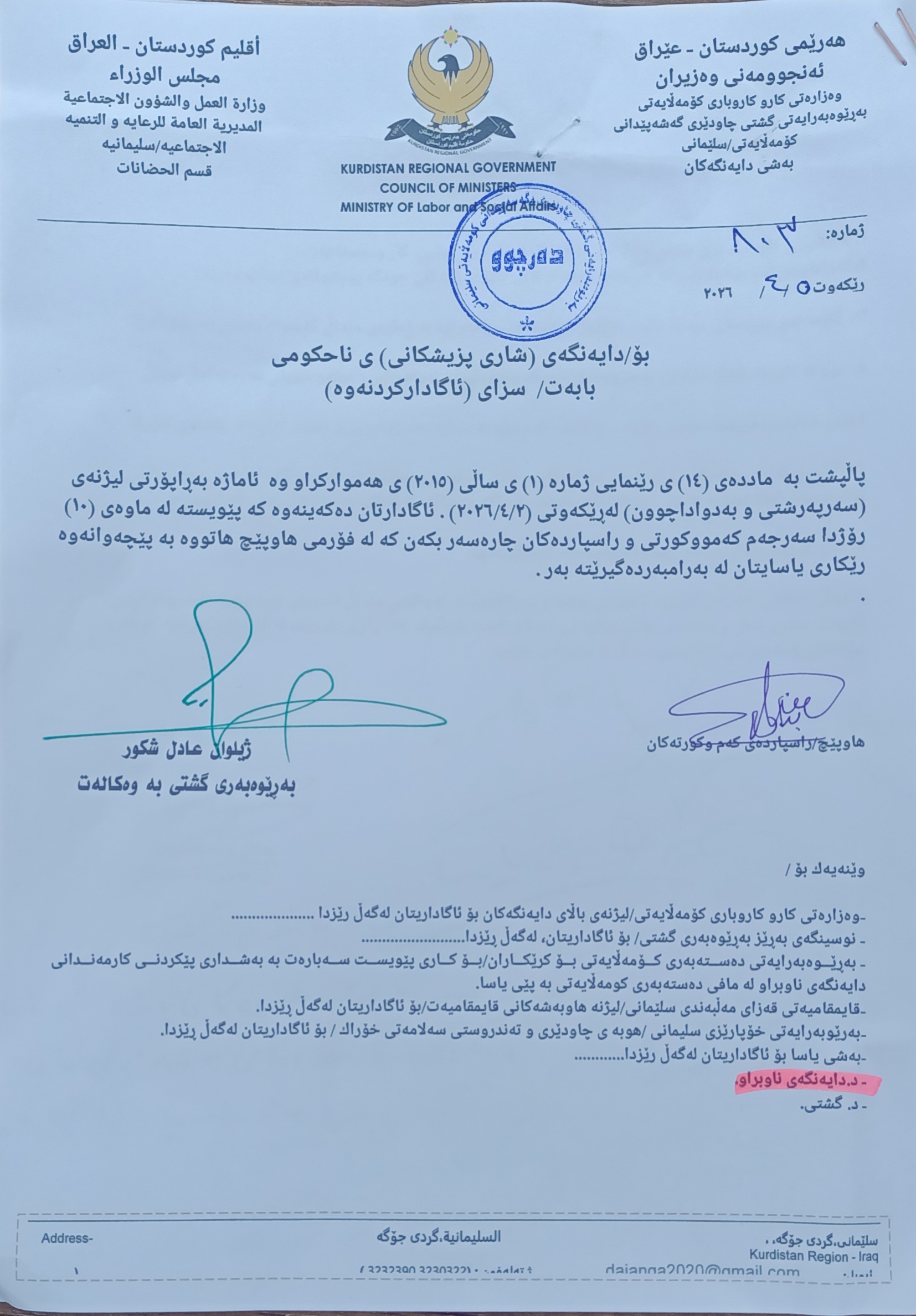 ناونیشان: سلێمانی - ڕێگای سهرهكی گهڕهكی بهكرهجۆ - بینای كۆمهڵگهی چاودێریی كۆمهڵایهتی سلێمانی.